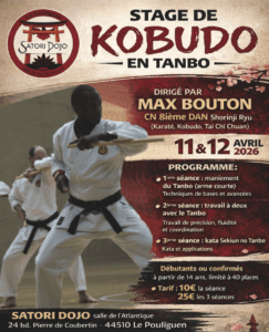 Un rendez-vous idéal pour approfondir sa pratique et découvrir la richesse d’une arme souvent méconnue mais essentielle dans l’étude du Kobudo : les bâtons courts. Le stage est sous la direction de Max Bouton, 8ième Dan Shorinji Ryu. Ce stage exceptionnel dans notre région permettra de découvrir ou redécouvrir le TANBO, une arme fondamentale du Kobudo et l’extension naturelle des poings du karateka. La pratique des bâtons courts nous permettra de réinterpréter la pratique de nos katas dans une vision plus large du Budo, et pourquoi pas de nous interroger sur le Bunkai de nos katas favoris ?